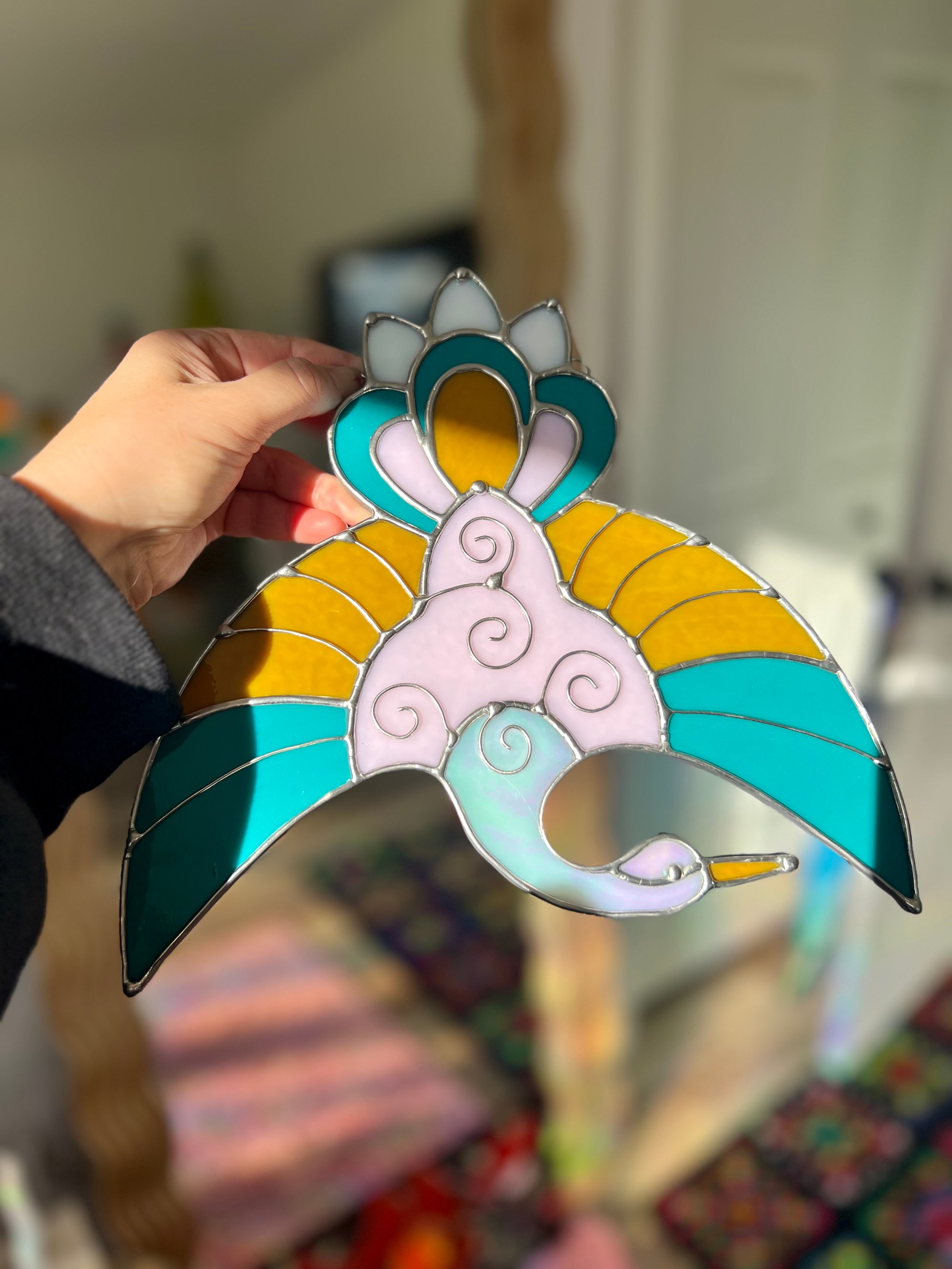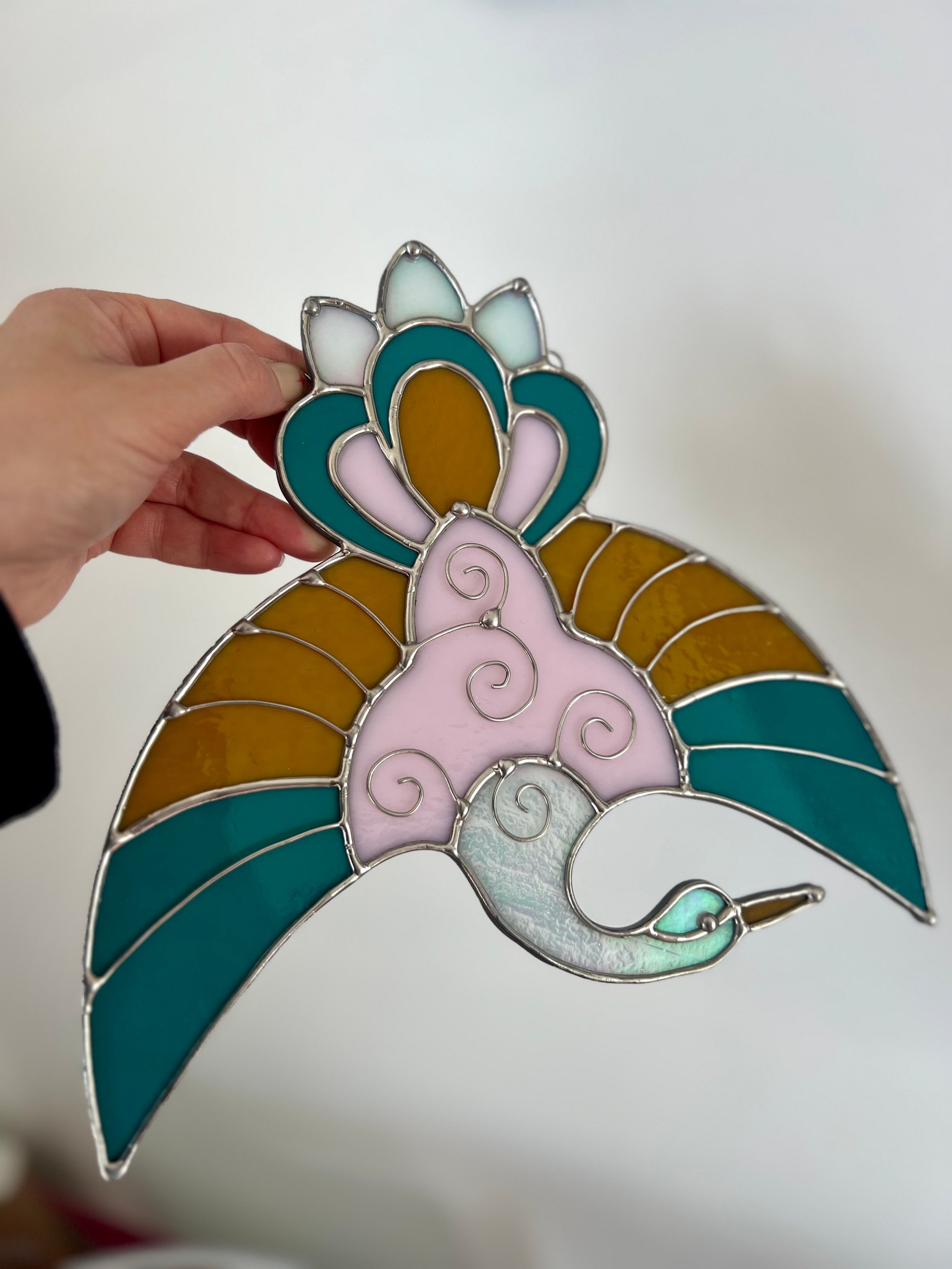 This piece measures approximately 8”x7” and comes with a silver chain for hanging. Intricate wire work and iridescent white glass make this piece special.