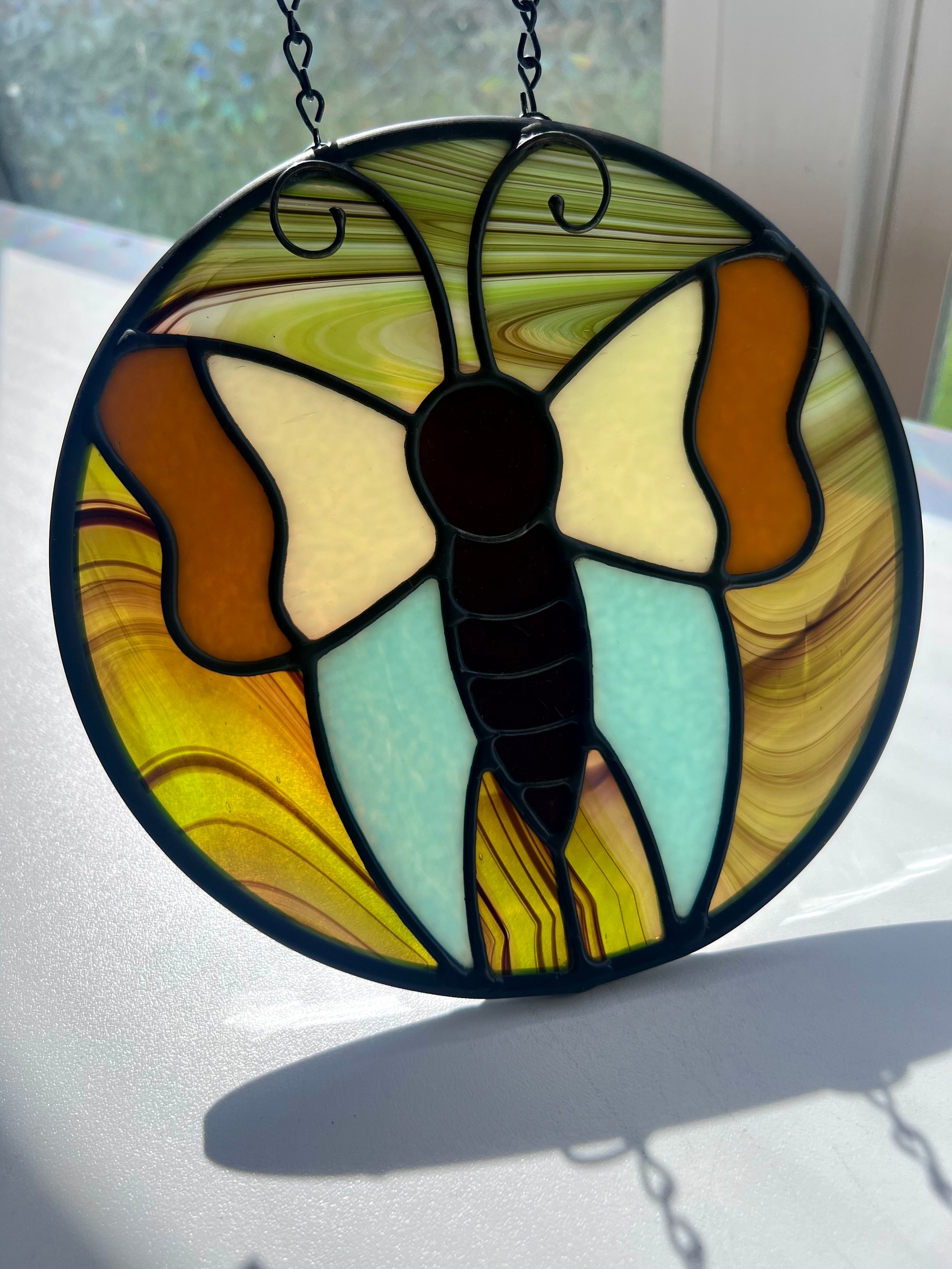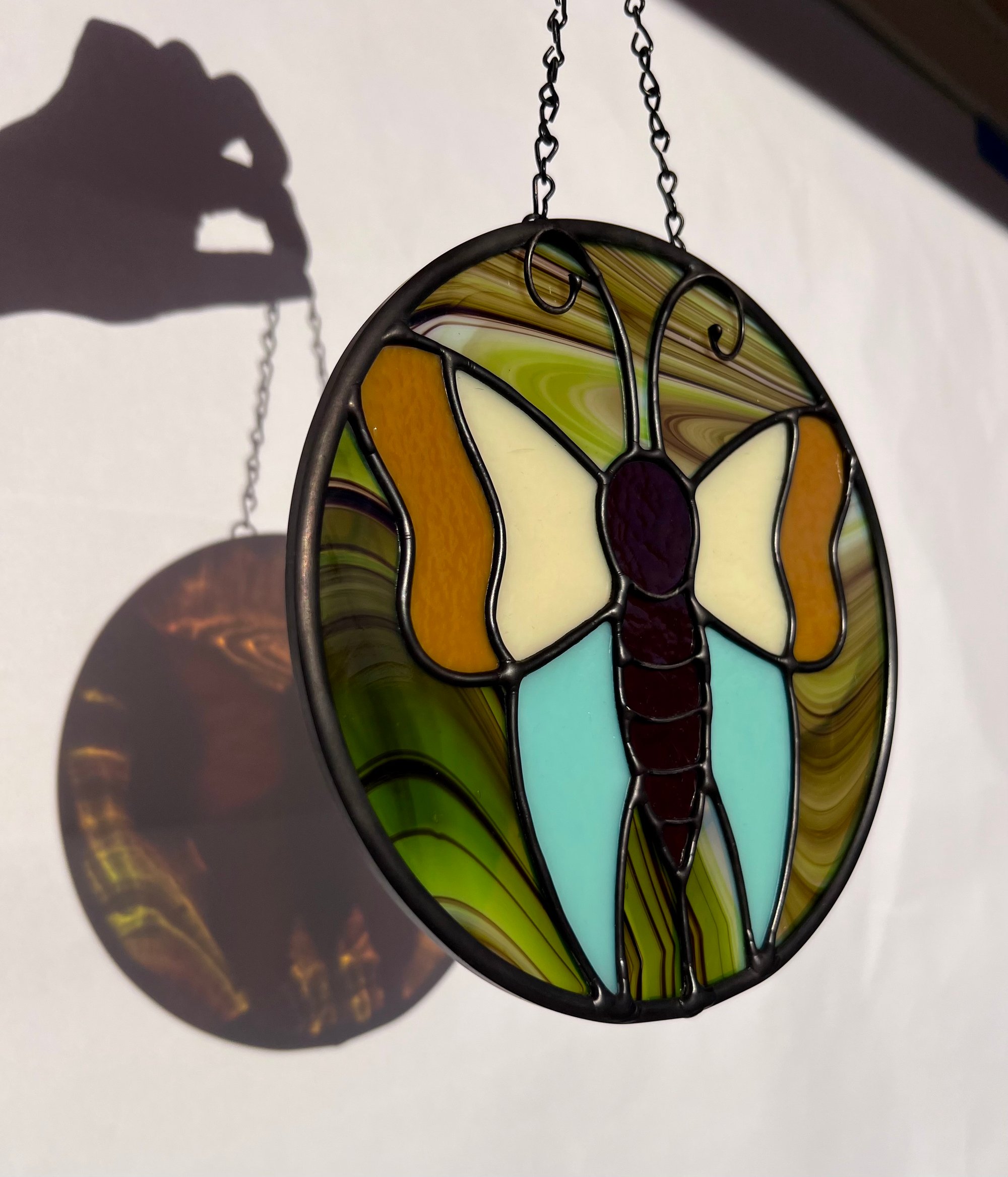 Measures 7 inches and has the prettiest swirly green background glass.