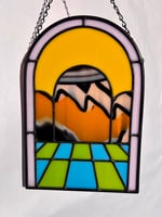 Measures around 9.5”x6” and comes ready to hang with a black chain. This piece features a fun one off glass by Bullseye and is made with all opaque glass so it would look just as good hung on the wall as it would in a window!