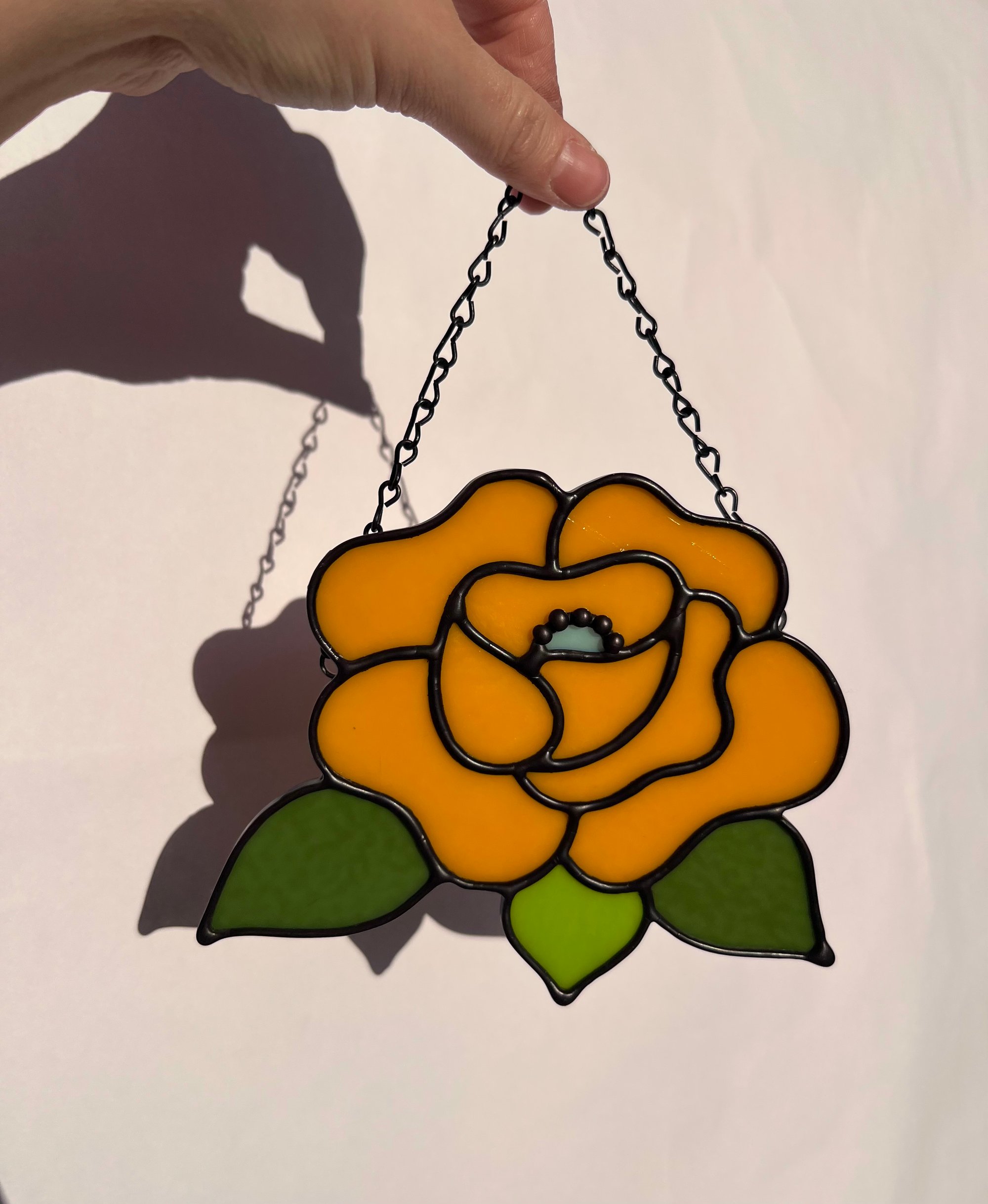 A rose measuring 6”x5” made in opaque glass in fun colors.